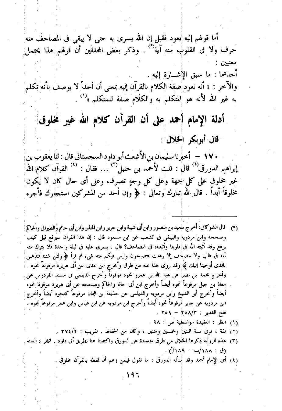 170 - أخبرنا سليمان بن الأشعث أبو داود السجستانى قال: حدثنا يعقوب بن إبراهيم الدورقى «3» قال: قلت لأحمد بن حنبل «4» ... فقال: «5» القرآن كلام اللّه غير مخلوق على كل جهة وعلى كل وجه تصرف وعلى أى حال كان لا يكون مخلوقا أبدا. قال اللّه تبارك وتعالى: وإِنْ أَحَدٌ مِنَ الْمُشْرِكِينَ اسْتَجارَكَ فَأَجِرْهُ