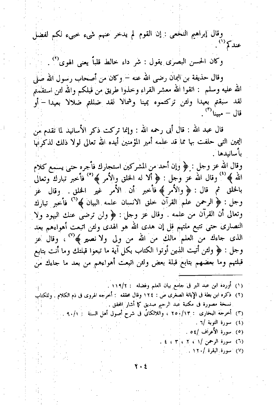 وقال اللّه عز وجل: وإِنْ أَحَدٌ مِنَ الْمُشْرِكِينَ اسْتَجارَكَ فَأَجِرْهُ حَتَّى يَسْمَعَ كَلامَ اللَّهِ «4» وقال اللّه عز وجل: أَلا لَهُ الْخَلْقُ والْأَمْرُ «5» فأخبر تبارك وتعالى بالخلق ثم قال: والْأَمْرُ فأخبر أن الأمر غير الخلق. وقال عز وجل: الرَّحْمنُ عَلَّمَ الْقُرْآنَ خَلَقَ الْإِنْسانَ عَلَّمَهُ الْبَيانَ «6» فأخبر تبارك وتعالى أن القرآن من علمه. وقال عز وجل: ولَنْ تَرْضى عَنْكَ الْيَهُودُ ولَا النَّصارى حَتَّى تَتَّبِعَ مِلَّتَهُمْ قُلْ إِنَّ هُدَى اللَّهِ هُوَ الْهُدى ولَئِنِ اتَّبَعْتَ أَهْواءَهُمْ بَعْدَ الَّذِي جاءَكَ مِنَ الْعِلْمِ ما لَكَ مِنَ اللَّهِ مِنْ وَلِيٍّ ولا نَصِيرٍ «7»، وقال عز وجل: ولَئِنْ أَتَيْتَ الَّذِينَ أُوتُوا الْكِتابَ بِكُلِّ آيَةٍ ما تَبِعُوا قِبْلَتَكَ وما أَنْتَ بِتابِعٍ قِبْلَتَهُمْ وما بَعْضُهُمْ بِتابِعٍ قِبْلَةَ بَعْضٍ ولَئِنِ اتَّبَعْتَ أَهْواءَهُمْ مِنْ بَعْدِ ما جاءَكَ مِنَ