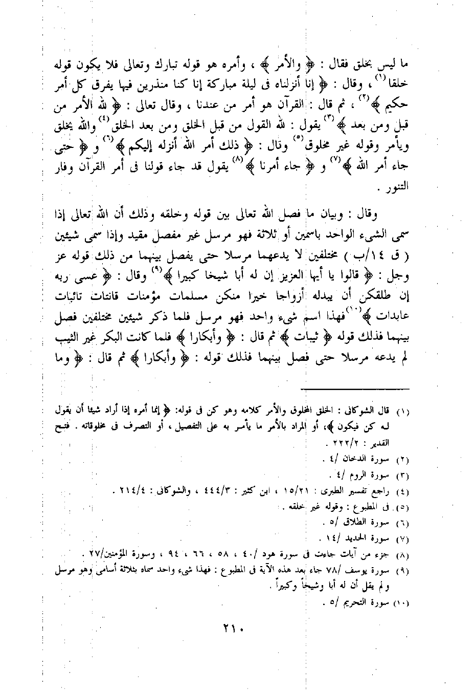 (1) قال الشوكانى: الخلق المخلوق والأمر كلامه وهو كن فى قوله: إِنَّما أَمْرُهُ إِذا أَرادَ شَيْئاً أَنْ يَقُولَ لَهُ كُنْ فَيَكُونُ، أو المراد بالأمر ما يأمر به على التفصيل، أو التصرف فى مخلوقاته. فتح القدير: 2/ 222.