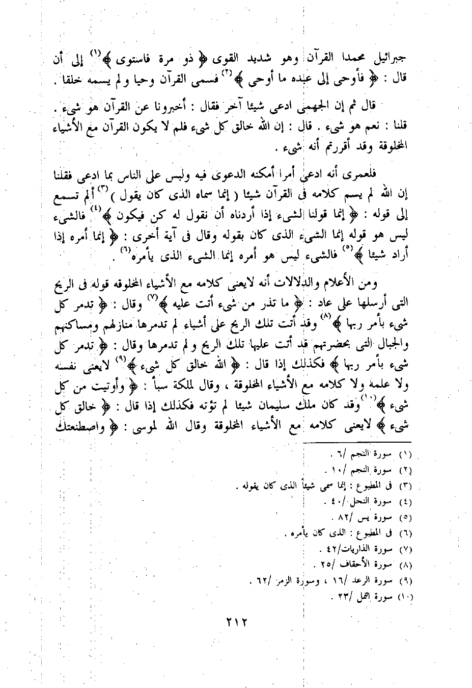 ومن الأعلام والدلالات أنه لا يعنى كلامه مع الأشياء المخلوقة قوله فى الريح التى أرسلها على عاد: ما تَذَرُ مِنْ شَيْءٍ أَتَتْ عَلَيْهِ «7» وقال: تُدَمِّرُ كُلَّ شَيْءٍ بِأَمْرِ رَبِّها «8» وقد أتت تلك الريح على أشياء لم تدمرها منازلهم ومساكنهم والجبال التى بحضرتهم قد أتت عليها تلك الريح ولم تدمرها وقال: تُدَمِّرُ كُلَّ شَيْءٍ بِأَمْرِ رَبِّها فكذلك إذا قال: اللَّهُ خالِقُ كُلِّ شَيْءٍ «9» لا يعنى نفسه ولا علمه ولا كلامه مع الأشياء المخلوقة، وقال لملكة سبأ: وأُوتِيَتْ مِنْ كُلِّ شَيْءٍ «10» وقد كان ملك سليمان شيئا لم تؤته فكذلك إذا قال: خالِقُ كُلِّ شَيْءٍ لا يعنى كلامه مع الأشياء المخلوقة وقال اللّه لموسى: واصْطَنَعْتُكَ