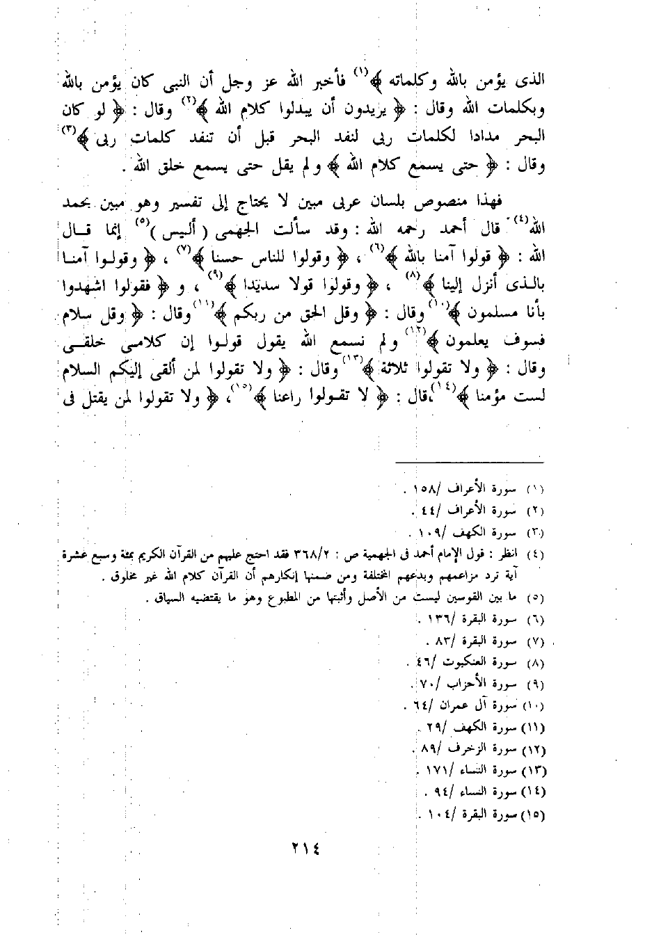 (4) انظر: قول الإمام أحمد فى الجهمية ص: 2/ 368 فقد احتج عليهم من القرآن الكريم بمائة وسبع عشرة آية ترد مزاعمهم وبدعهم المختلفة ومن ضمنها إنكارهم أن القرآن كلام اللّه غير مخلوق.