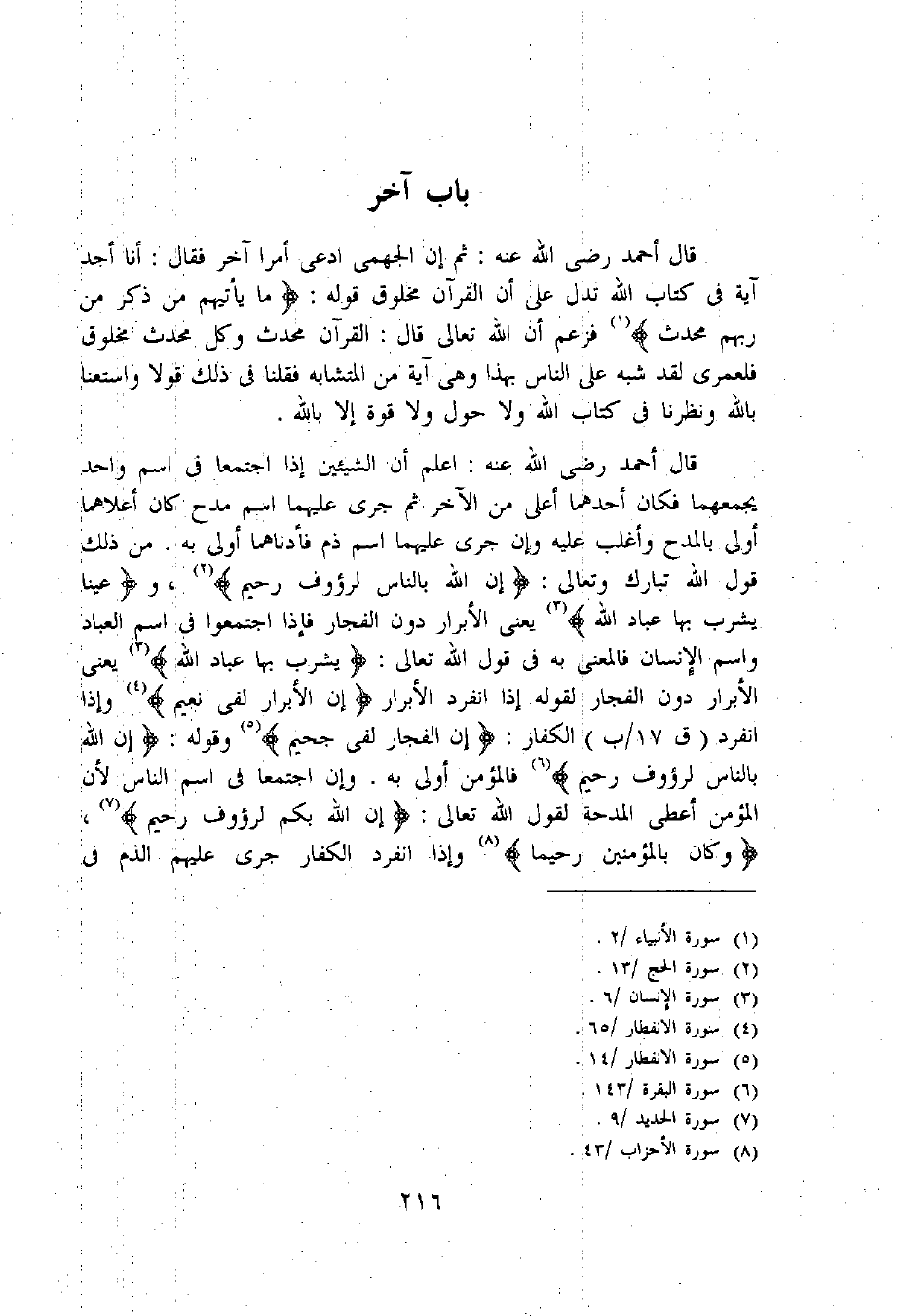 قال أحمد رضى اللّه عنه: اعلم أن الشيئين إذا اجتمعا فى اسم واحد يجمعهما فكان أحدهما أعلى من الآخر ثم جرى عليهما اسم مدح كان أعلاهما أولى بالمدح وأغلب عليه وإن جرى عليهما اسم ذم فأدناهما أولى به. من ذلك قول اللّه تبارك وتعالى: إِنَّ اللَّهَ بِالنَّاسِ لَرَؤُفٌ رَحِيمٌ «2»، وعَيْناً يَشْرَبُ بِها عِبادُ اللَّهِ «3» يعنى الأبرار دون الفجار فإذا اجتمعوا فى اسم العباد واسم الإنسان فالمعنى به فى قول اللّه تعالى: يَشْرَبُ بِها عِبادُ اللَّهِ «3» يعنى الأبرار دون الفجار لقوله إذا انفرد الأبرار إِنَّ الْأَبْرارَ لَفِي نَعِيمٍ «4» وإذا انفرد (ق 17/ ب) الكفار: إِنَّ الْفُجَّارَ لَفِي جَحِيمٍ «5» وقوله: إِنَّ اللَّهَ بِالنَّاسِ لَرَؤُفٌ رَحِيمٌ «6» فالمؤمن أولى به. وإن اجتمعا فى اسم الناس لأن المؤمن أعطى المدحة لقول اللّه تعالى: إِنَّ اللَّهَ بِكُمْ لَرَؤُفٌ رَحِيمٌ «7»، وكانَ بِالْمُؤْمِنِينَ رَحِيماً «8» وإذا انفرد الكفار جرى عليهم الذم فى