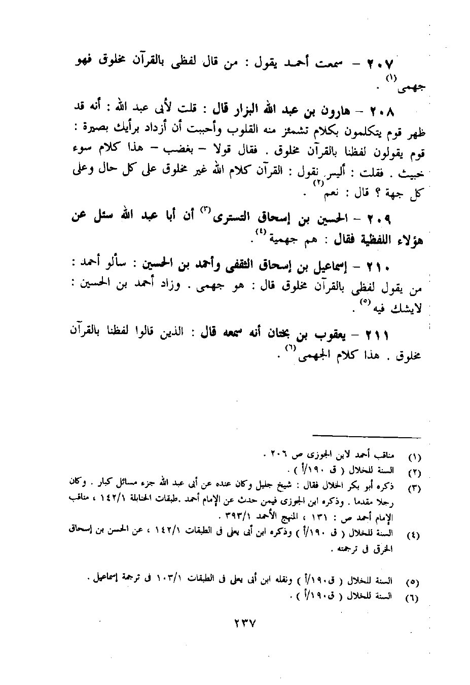 207 - سمعت أحمد يقول: من قال لفظى بالقرآن مخلوق فهو جهمى «1».