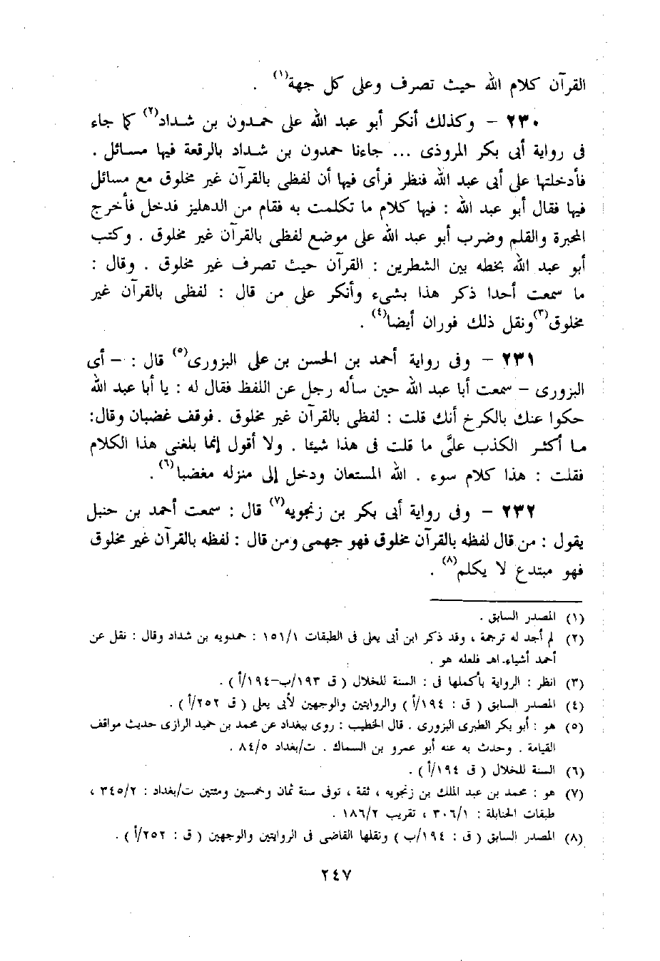 232 - وفى رواية أبى بكر بن زنجويه «7» قال: سمعت أحمد بن حنبل يقول: من قال لفظه بالقرآن مخلوق فهو جهمى ومن قال: لفظه بالقرآن غير مخلوق فهو مبتدع لا يكلم «8».