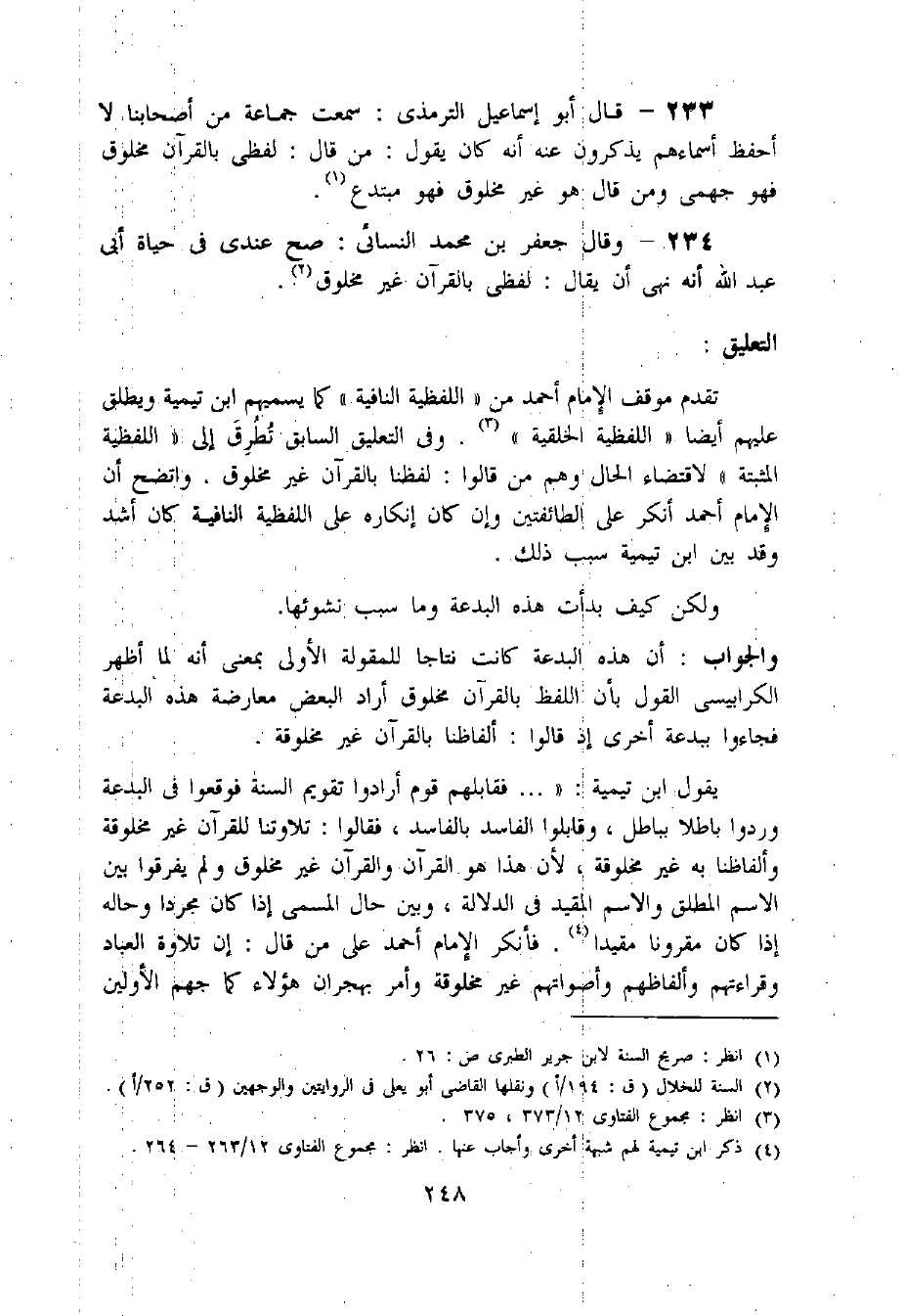 234 - وقال جعفر بن محمد النسائى: صح عندى فى حياة أبى عبد اللّه أنه نهى أن يقال: لفظى بالقرآن غير مخلوق «2».