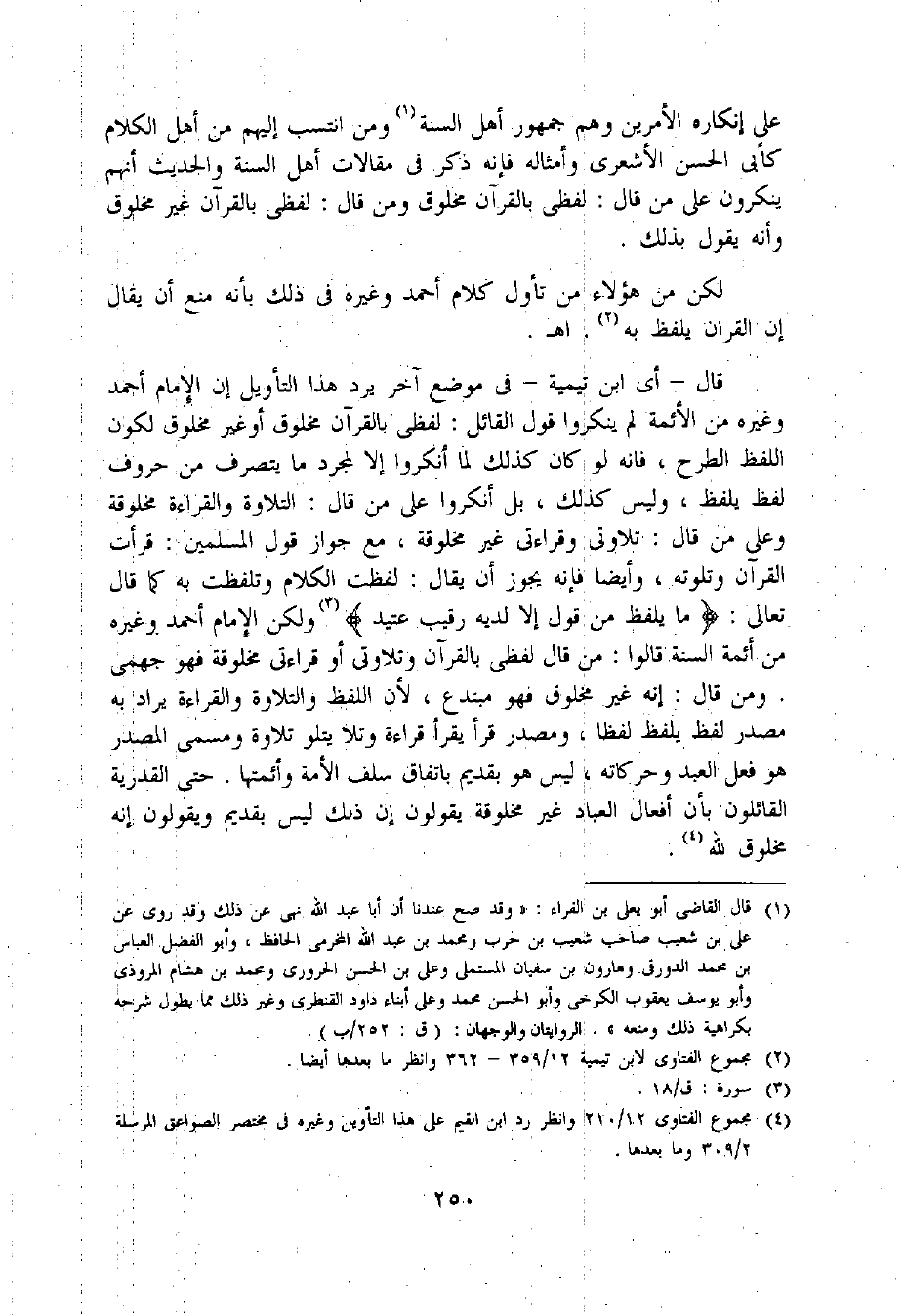 قال- أى ابن تيمية- فى موضع آخر يرد هذا التأويل إن الإمام أحمد وغيره من الأئمة لم ينكروا قول القائل: لفظى بالقرآن مخلوق أو غير مخلوق لكون اللفظ الطرح، فانه لو كان كذلك لما أنكروا إلا لمجرد ما يتصرف من حروف لفظ يلفظ، وليس كذلك، بل أنكروا على من قال: التلاوة والقراءة مخلوقة وعلى من قال: تلاوتى وقراءتى غير مخلوقة، مع جواز قول المسلمين: قرأت القرآن وتلوته، وأيضا فإنه يجوز أن يقال: لفظت الكلام وتلفظت به كما قال تعالى: ما يَلْفِظُ مِنْ قَوْلٍ إِلَّا لَدَيْهِ رَقِيبٌ عَتِيدٌ «3» ولكن الإمام أحمد وغيره من أئمة السنة قالوا: من قال لفظى بالقرآن وتلاوتى أو قراءتى مخلوقة فهو جهمى. ومن قال: إنه غير مخلوق فهو مبتدع، لأن اللفظ والتلاوة والقراءة يراد به مصدر لفظ يلفظ لفظا، ومصدر قرأ يقرأ قراءة وتلا يتلو تلاوة ومسمى المصدر هو فعل العبد وحركاته، ليس هو بقديم باتفاق سلف الأمة وأئمتها. حتى القدرية القائلون بأن أفعال العباد غير مخلوقة يقولون إن ذلك ليس بقديم ويقولون إنه مخلوق للّه «4».