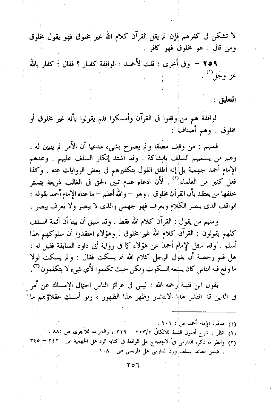 (3) وانظر ما ذكره الدارمى فى الاحتجاج على الواقفة فى كتابه الرد على الجهمية ص: 342 - 345، ضمن عقائد السلف ورد الدارمى على المريسى ص: 108.