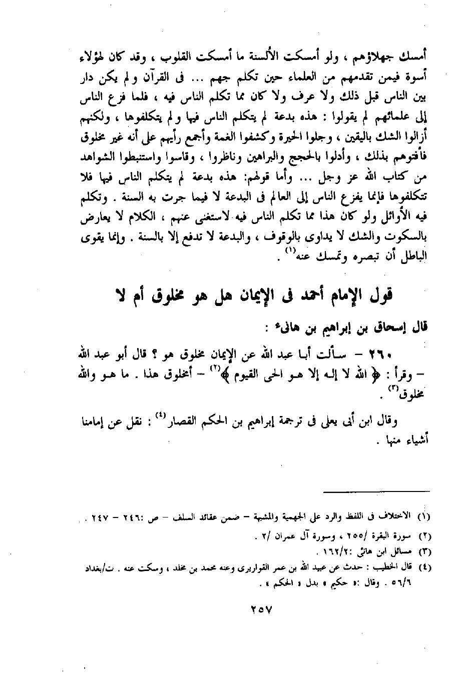 260 - سألت أبا عبد اللّه عن الإيمان مخلوق هو؟ قال أبو عبد اللّه- وقرأ: اللَّهُ لا إِلهَ إِلَّا هُوَ الْحَيُّ الْقَيُّومُ «2» - أ مخلوق هذا. ما هو واللّه مخلوق «3».