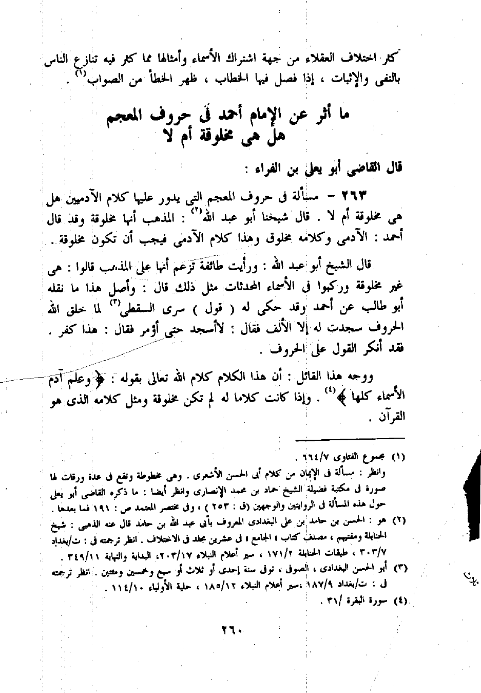 263 - مسألة فى حروف المعجم التى يدور عليها كلام الآدميين هل هى مخلوقة أم لا. قال شيخنا أبو عبد اللّه «2»: المذهب أنها مخلوقة وقد قال أحمد: الآدمى وكلامه مخلوق وهذا كلام الآدمى فيجب أن تكون مخلوقة.