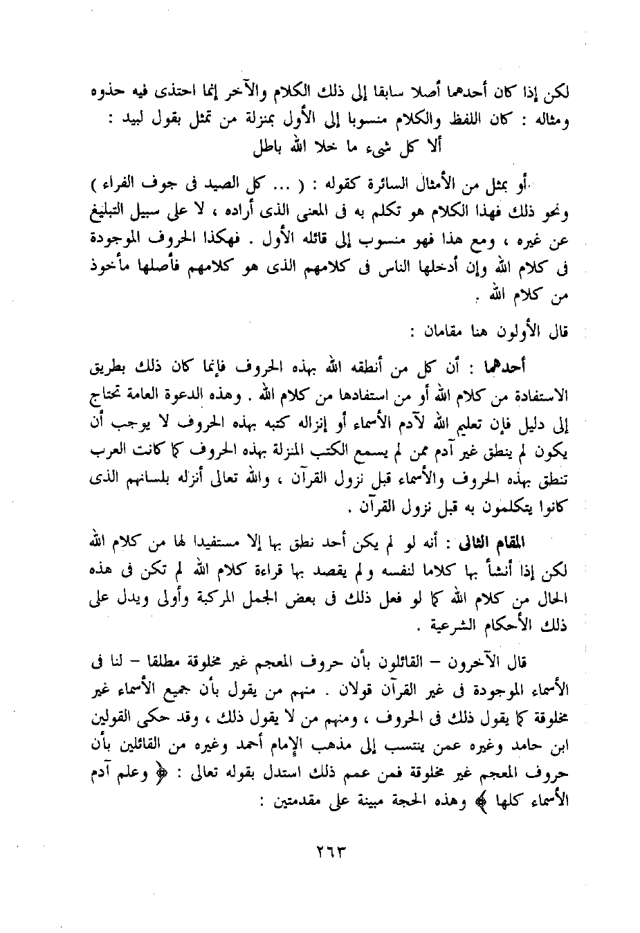 قال الآخرون- القائلون بأن حروف المعجم غير مخلوقة مطلقا- لنا فى الأسماء الموجودة فى غير القرآن قولان. منهم من يقول بأن جميع الأسماء غير مخلوقة كما يقول ذلك فى الحروف، ومنهم من لا يقول ذلك، وقد حكى القولين ابن حامد وغيره عمن ينتسب إلى مذهب الإمام أحمد وغيره من القائلين بأن حروف المعجم غير مخلوقة فمن عمم ذلك استدل بقوله تعالى: وعَلَّمَ آدَمَ الْأَسْماءَ كُلَّها وهذه الحجة مبينة على مقدمتين: