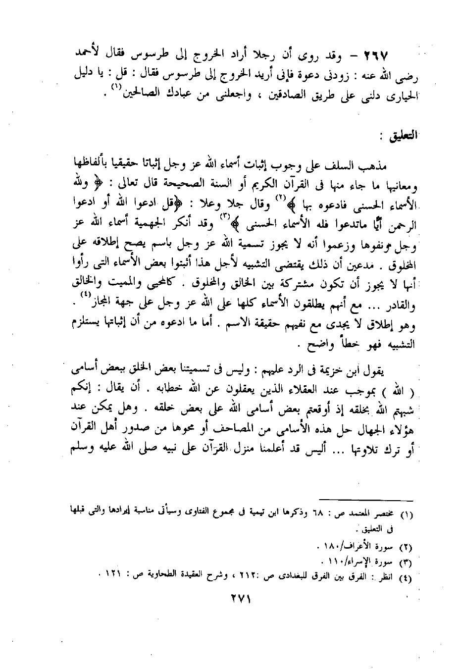 267 - وقد روى أن رجلا أراد الخروج إلى طرسوس فقال لأحمد رضى اللّه عنه: زودنى دعوة فإنى أريد الخروج إلى طرسوس فقال: قل: يا دليل الحيارى دلنى على طريق الصادقين، واجعلنى من عبادك الصالحين «1».