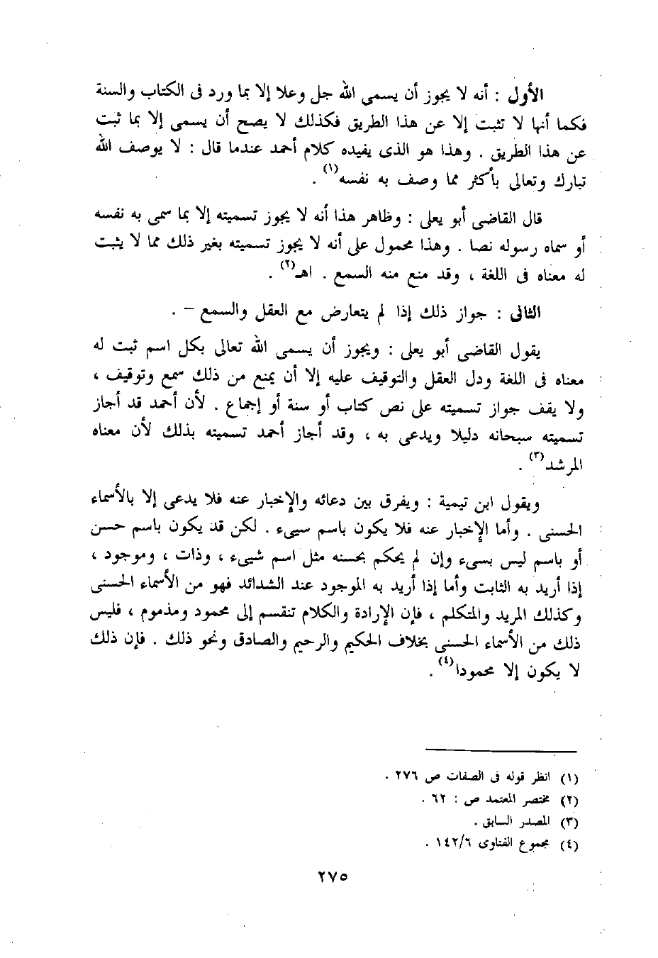 الأول: أنه لا يجوز أن يسمى اللّه جل وعلا إلا بما ورد فى الكتاب والسنة فكما أنها لا تثبت إلا عن هذا الطريق فكذلك لا يصح أن يسمى إلا بما ثبت عن هذا الطريق. وهذا هو الّذي يفيده كلام أحمد عند ما قال: لا يوصف اللّه تبارك وتعالى بأكثر مما وصف به نفسه «1».