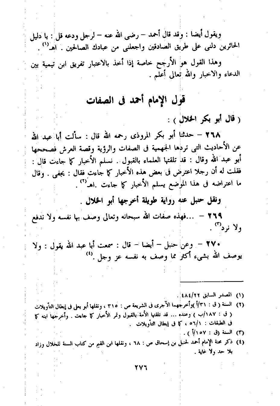 270 - وعن حنبل- أيضا- قال: سمعت أبا عبد اللّه يقول: ولا يوصف اللّه بشيء أكثر مما وصف به نفسه عز وجل. «4»