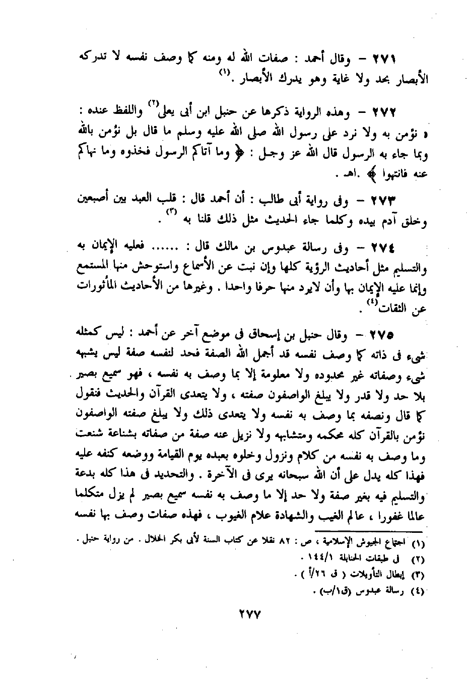 274 - وفى رسالة عبدوس بن مالك قال: ...... فعليه الإيمان به والتسليم مثل أحاديث الرؤية كلها وإن نبت عن الأسماع واستوحش منها المستمع وإنما عليه الإيمان بها وأن لا يرد منها حرفا واحدا. وغيرها من الأحاديث المأثورات عن الثقات «4».