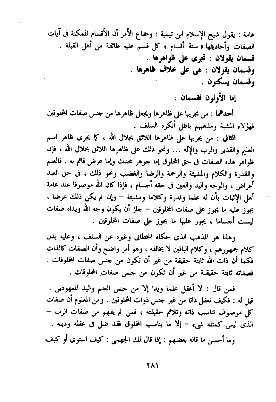عامة: يقول شيخ الإسلام ابن تيمية: وجماع الأمر أن الأقسام الممكنة فى آيات الصفات وأحاديثها «ستة أقسام» كل قسم عليه طائفة من أهل القبلة.