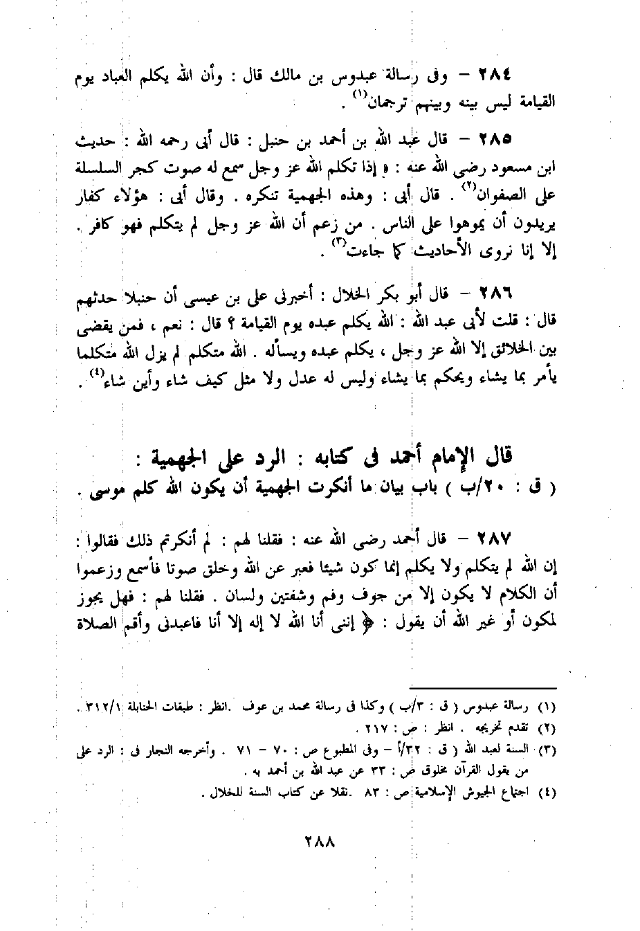 286 - قال أبو بكر الخلال: أخبرنى على بن عيسى أن حنبلا حدثهم قال: قلت لأبى عبد اللّه: اللّه يكلم عبده يوم القيامة؟ قال: نعم، فمن يقضى بين الخلائق إلا اللّه عز وجل، يكلم عبده ويسأله. اللّه متكلم لم يزل اللّه متكلما يأمر بما يشاء ويحكم بما يشاء وليس له عدل ولا مثل كيف شاء وأين شاء «4».