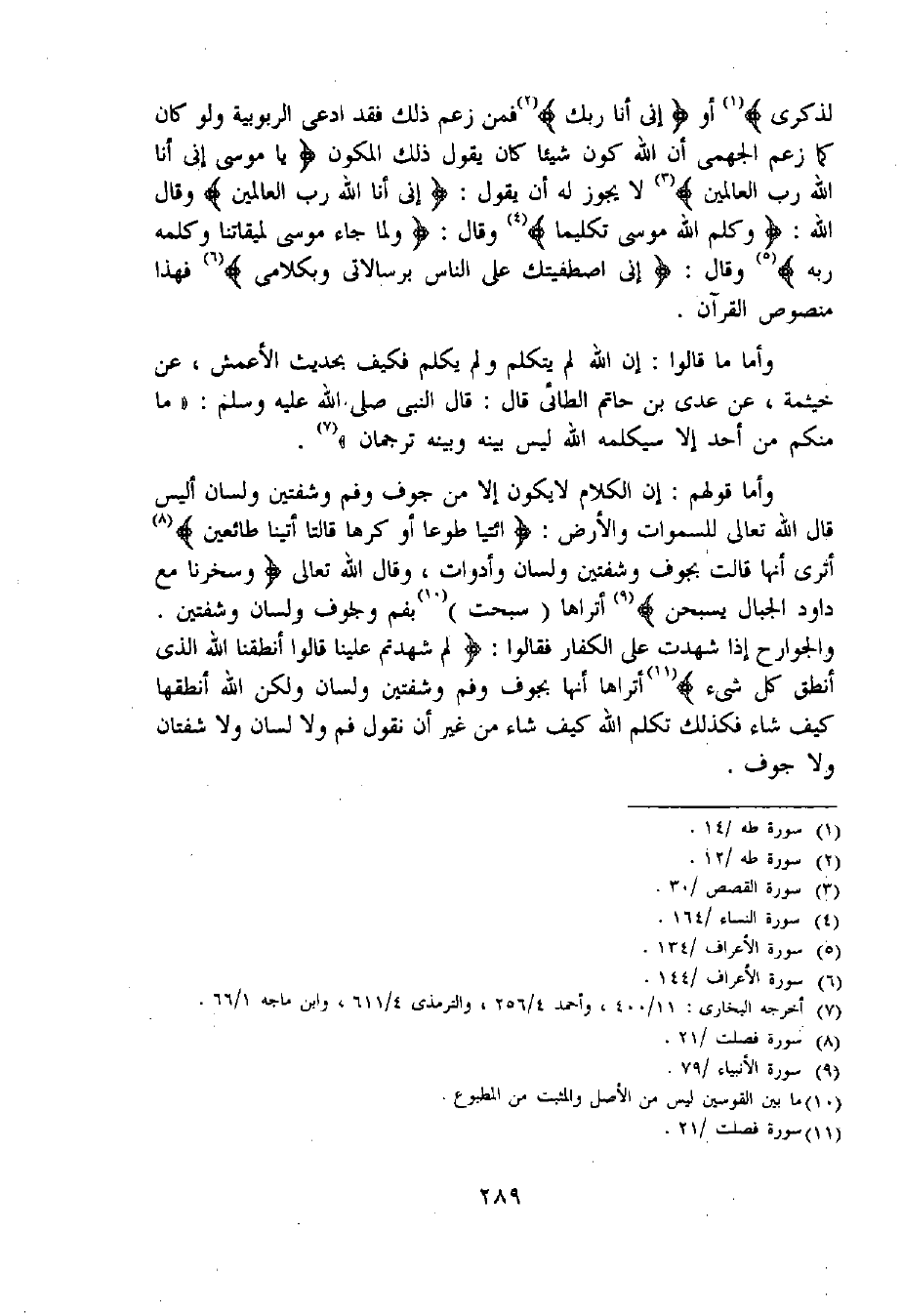 وأما قولهم: إن الكلام لا يكون إلا من جوف وفم وشفتين ولسان أ ليس قال اللّه تعالى للسماوات والأرض: ائْتِيا طَوْعاً أَوْ كَرْهاً قالَتا أَتَيْنا طائِعِينَ «8» أ ترى أنها قالت بجوف وشفتين ولسان وأدوات، وقال اللّه تعالى وسَخَّرْنا مَعَ داوُدَ الْجِبالَ يُسَبِّحْنَ «9» أ تراها (سبحت) «10» بفم وجوف ولسان وشفتين.