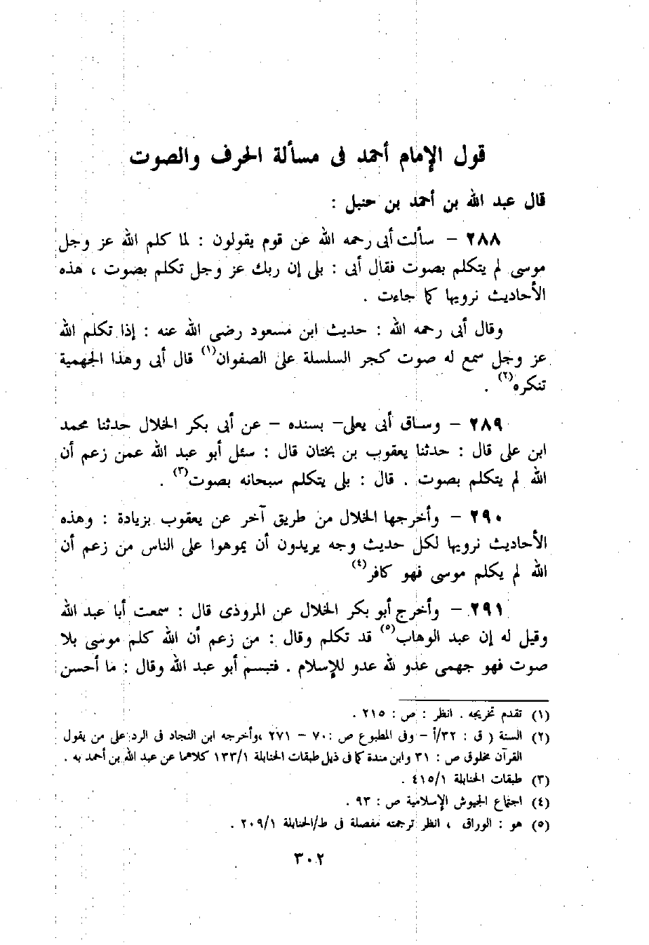 291 - وأخرج أبو بكر الخلال عن المروزي قال: سمعت أبا عبد اللّه وقيل له إن عبد الوهاب «5» قد تكلم وقال: من زعم أن اللّه كلم موسى بلا صوت فهو جهمى عدو للّه عدو للإسلام. فتبسم أبو عبد اللّه وقال: ما أحسن