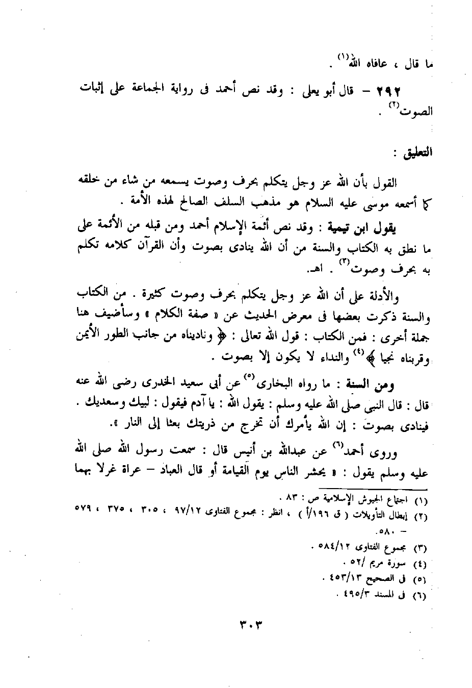 292 - قال أبو يعلى: وقد نص أحمد فى رواية الجماعة على إثبات الصوت «2».