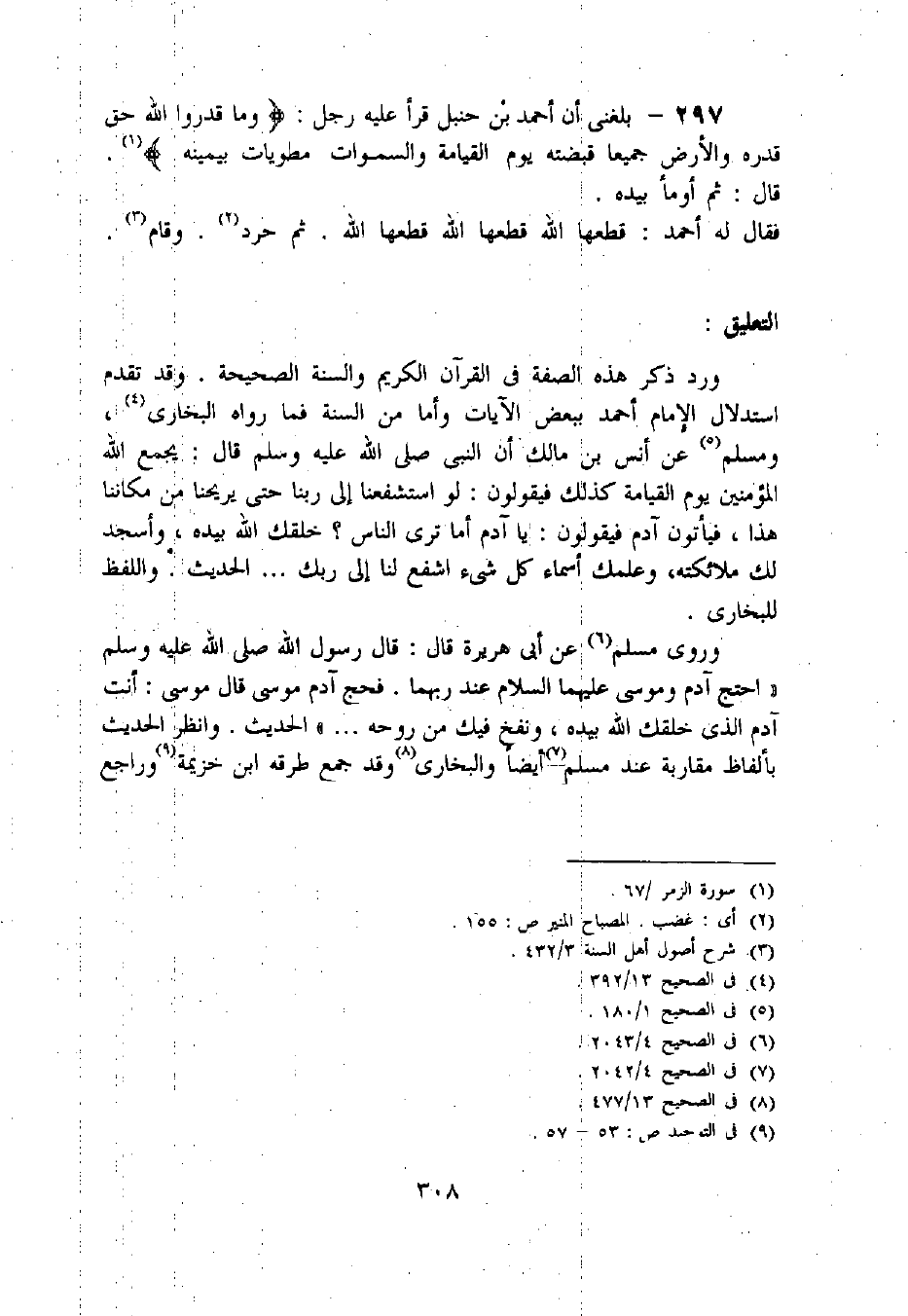 297 - بلغنى أن أحمد بن حنبل قرأ عليه رجل: وما قَدَرُوا اللَّهَ حَقَّ قَدْرِهِ والْأَرْضُ جَمِيعاً قَبْضَتُهُ يَوْمَ الْقِيامَةِ والسَّماواتُ مَطْوِيَّاتٌ بِيَمِينِهِ «1».