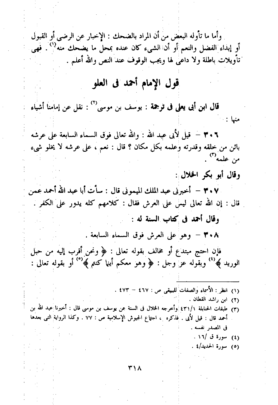307 - أخبرنى عبد الملك الميمونى قال: سألت أبا عبد اللّه أحمد عمن قال: إن اللّه تعالى ليس على العرش فقال: كلامهم كله يدور على الكفر.