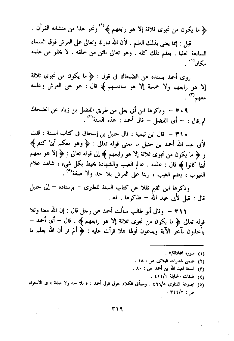 310 - قال ابن تيمية: قال حنبل بن إسحاق فى كتاب السنة: قلت لأبى عبد اللّه أحمد بن حنبل ما معنى قوله تعالى: وهُوَ مَعَكُمْ أَيْنَ ما كُنْتُمْ وما يَكُونُ مِنْ نَجْوى ثَلاثَةٍ إِلَّا هُوَ رابِعُهُمْ إلى قوله تعالى: إِلَّا هُوَ مَعَهُمْ أَيْنَ ما كانُوا قال: علمه. عالم الغيب والشهادة يحيط بكل شيء، شاهد علام الغيوب، يعلم الغيب، ربنا على العرش بلا حد ولا صفة «5».