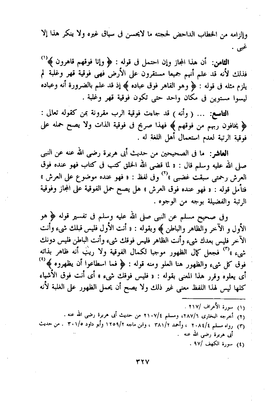 وفى صحيح مسلم عن النبي صلى اللّه عليه وسلم فى تفسير قوله هُوَ الْأَوَّلُ والْآخِرُ والظَّاهِرُ والْباطِنُ وبقوله: «أنت الأول فليس قبلك شيء وأنت الآخر فليس بعدك شيء وأنت الظاهر فليس فوقك شيء وأنت الباطن فليس دونك شيء» «3» فجعل كمال الظهور موجبا لكمال الفوقية ولا ريب أنه ظاهر بذاته فوق كل شيء والظهور هنا العلو ومنه قوله: فَمَا اسْطاعُوا أَنْ يَظْهَرُوهُ «4» أى يعلوه وقرر هذا المعنى بقوله: «فليس فوقك شيء» أى أنت فوق الأشياء كلها ليس لهذا اللفظ معنى غير ذلك ولا يصح أن يحمل الظهور على الغلبة لأنه