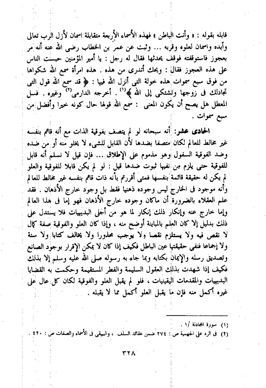 الحادى عشر: أنه سبحانه لو لم يتصف بفوقية الذات مع أنه قائم بنفسه غير مخالط للعالم لكان متصفا بضدها لأن القابل للشىء لا يخلو منه أو من ضده وضد الفوقية السفول وهو مذموم على الإطلاق ... فإن قيل لا نسلم أنه قابل للفوقية حتى يلزم من نفيها ثبوت ضدها قيل: لو لم يكن قابلا للفوقية والعلو لم يكن له حقيقة قائمة بنفسها فمتى أقررتم بأنه ذات قائم بنفسه غير مخالط للعالم وأنه موجود فى الخارج ليس وجوده ذهنيا فقط بل وجود خارج الأذهان. فقد علم العقلاء بالضرورة أن ما كان وجوده خارج الأذهان فهو إما فى هذا العالم وإما خارج عنه وإنكار ذلك إنكار لما هو من أجلى البديهيات فلا يستدل على ذلك بدليل إلا كان العلم بالمباينة أوضح منه، وإذا كان العلو والفوقية صفة كمال لا نقص فيه ولا يستلزم نقصا ولا يوجب محذورا ولا يخالف كتابا ولا سنة ولا إجماعا فنفى حقيقتها عين الباطل فكيف إذا كان لا يمكن الإقرار بوجود الصانع وتصديق رسله والإيمان بكتابه وبما جاء به رسوله صلى اللّه عليه وسلم إلا بذلك فكيف إذا شهدت بذلك العقول السليمة والفطر المستقيمة وحكمت به القضايا البديهيات والمقدمات اليقينيات، فلو لم يقبل العلو والفوقية لكان كل عال على غيره أكمل منه فإن ما يقبل العلو أكمل مما لا يقبله.