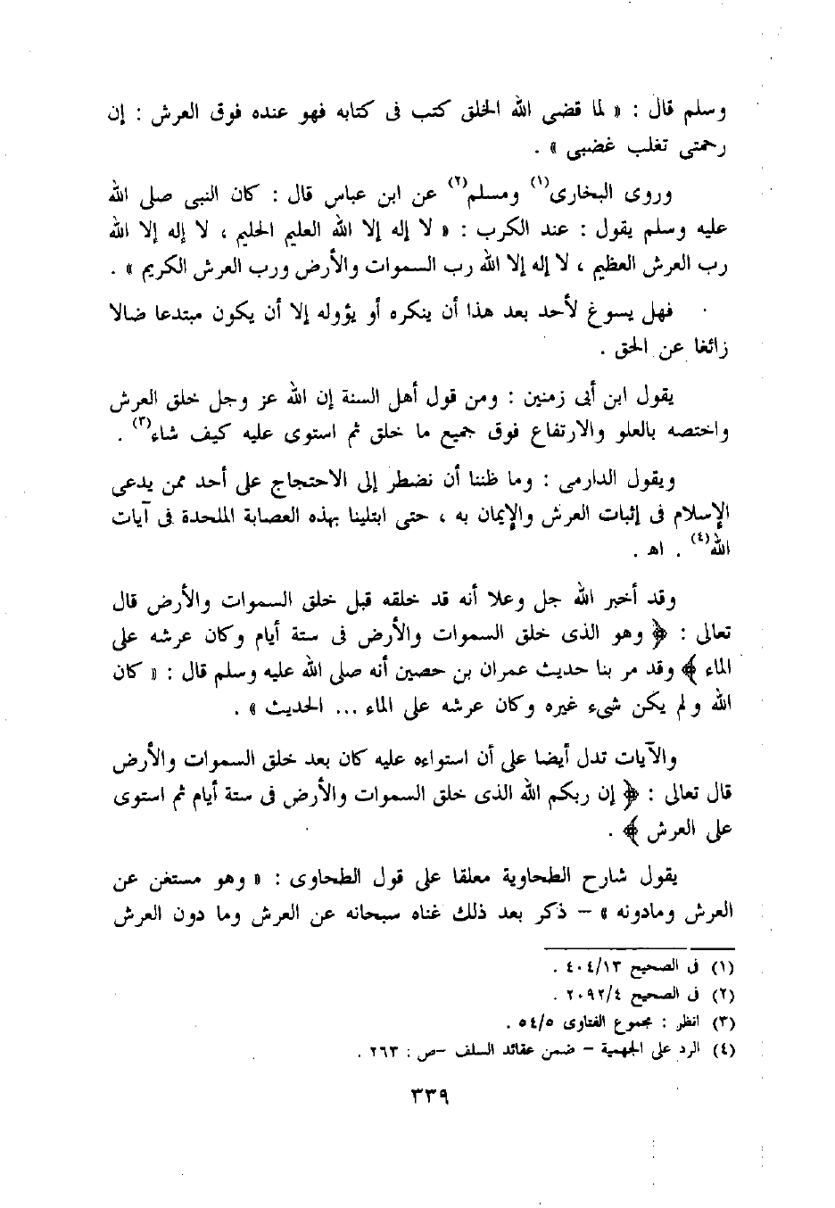 ويقول الدارمى: وما ظننا أن نضطر إلى الاحتجاج على أحد ممن يدعى الإسلام فى إثبات العرش والإيمان به، حتى ابتلينا بهذه العصابة الملحدة فى آيات اللّه «4». اه.