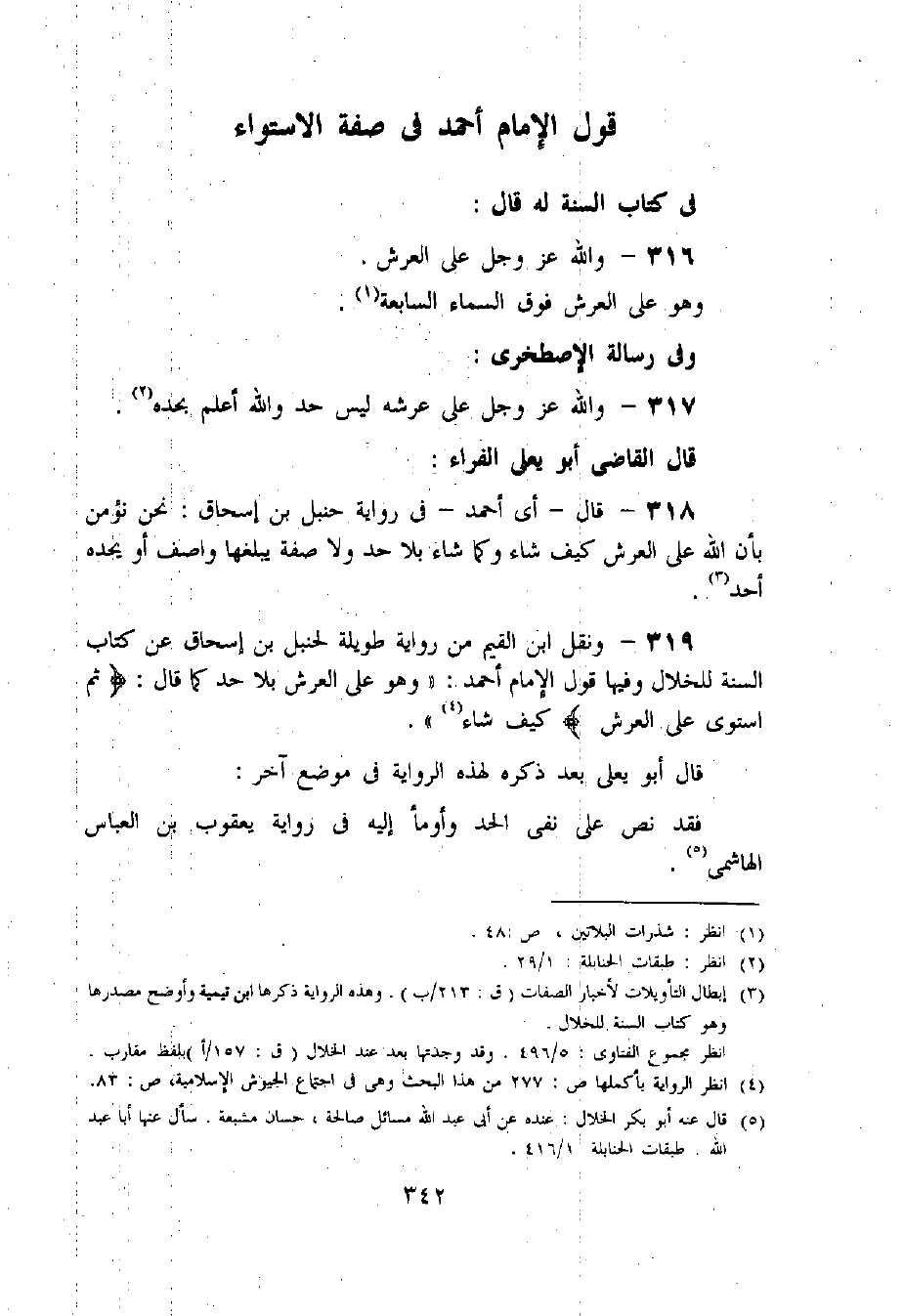 318 - قال- أى أحمد- فى رواية حنبل بن إسحاق: نحن نؤمن بأن اللّه على العرش كيف شاء وكما شاء بلا حد ولا صفة يبلغها واصف أو يحده أحد «3».