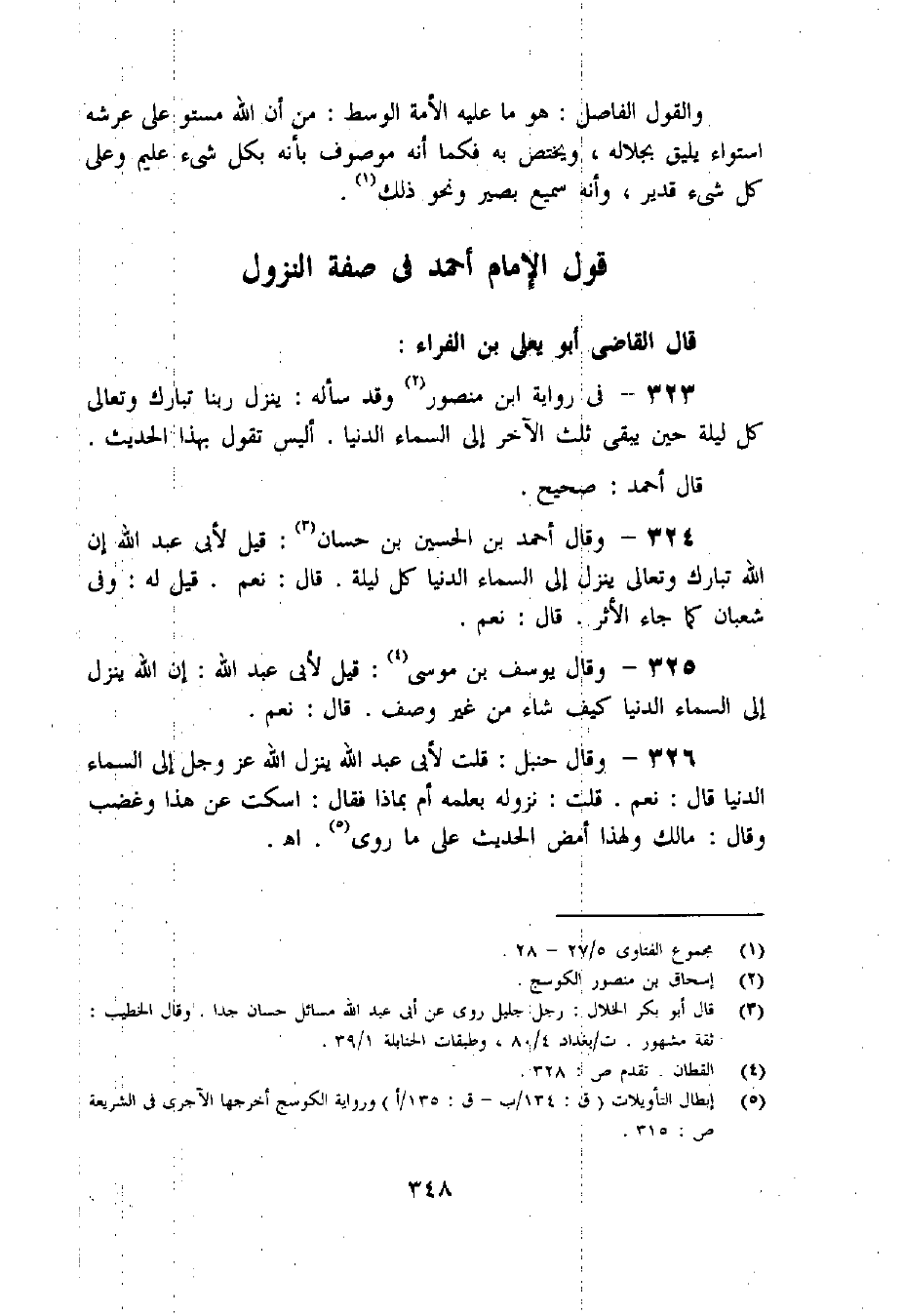 325 - وقال يوسف بن موسى «4»: قيل لأبى عبد اللّه: إن اللّه ينزل إلى السماء الدنيا كيف شاء من غير وصف. قال: نعم.