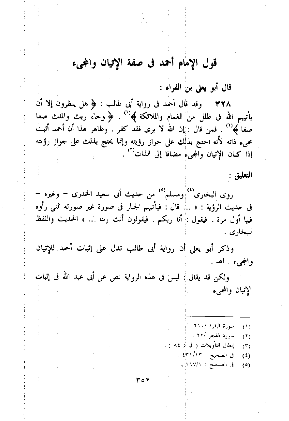 328 - وقد قال أحمد فى رواية أبى طالب: هَلْ يَنْظُرُونَ إِلَّا أَنْ يَأْتِيَهُمُ اللَّهُ فِي ظُلَلٍ مِنَ الْغَمامِ والْمَلائِكَةُ «1». وجاءَ رَبُّكَ والْمَلَكُ صَفًّا صَفًّا «2». فمن قال: إن اللّه لا يرى فقد كفر. وظاهر هذا أن أحمد أثبت مجىء ذاته لأنه احتج بذلك على جواز رؤيته وإنما يحتج بذلك على جواز رؤيته إذا كان الإتيان والمجىء مضافا إلى الذات «3».
