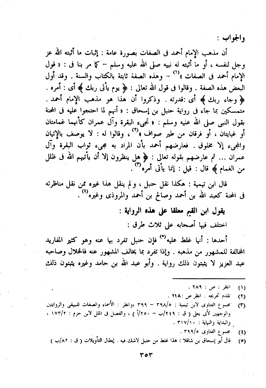 (3) مجموع الفتاوى لابن تيمية: 5/ 398 - 399، وانظر: الأسماء والصفات للبيهقى والروايتين والوجهين لأبى يعلى (ق: 249/ ب- 250/ أ)، والفصل فى الملل لابن حزم: 2/ 173، والبداية والنهاية: 10/ 317.