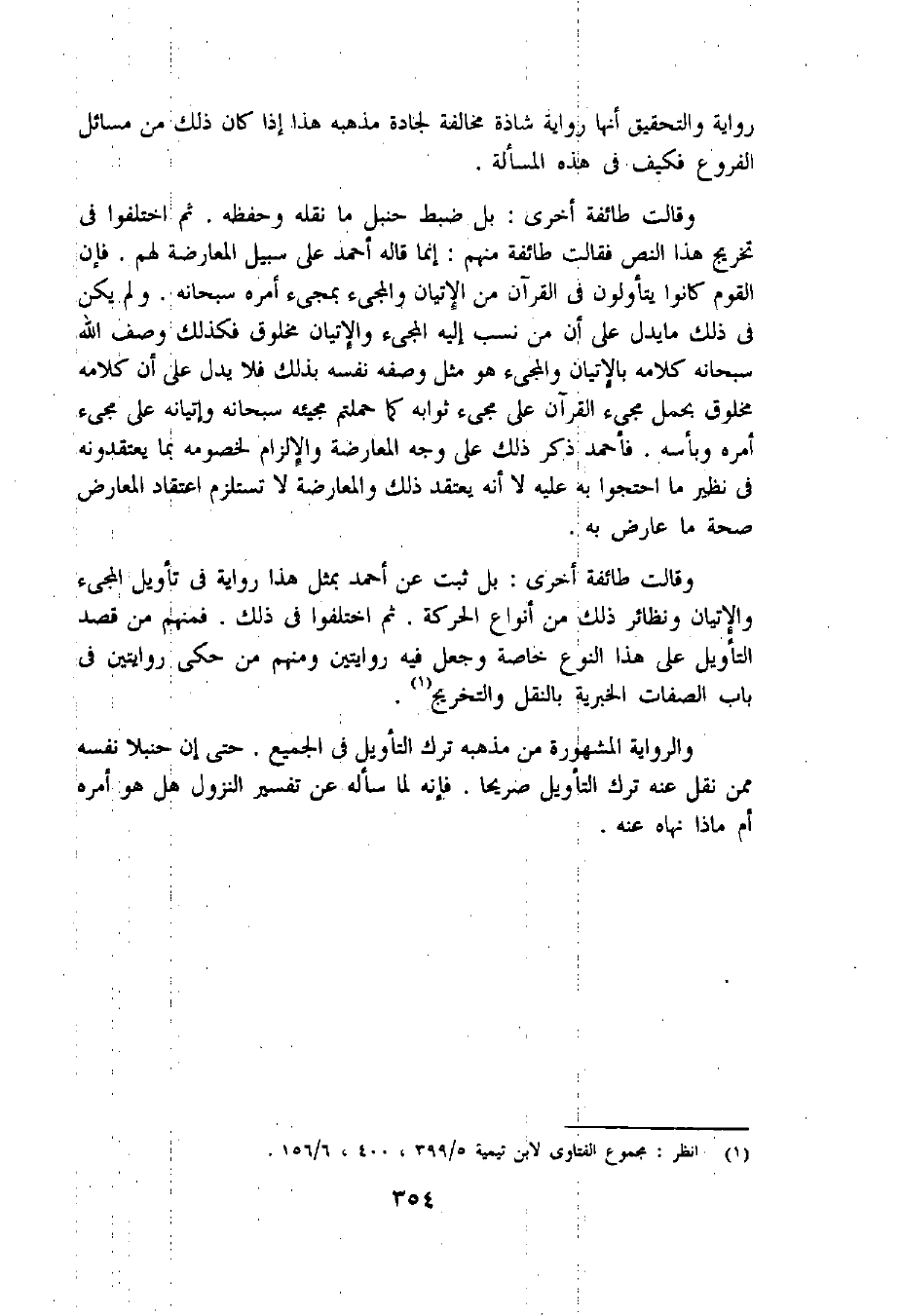 وقالت طائفة أخرى: بل ثبت عن أحمد بمثل هذا رواية فى تأويل المجىء والإتيان ونظائر ذلك من أنواع الحركة. ثم اختلفوا فى ذلك. فمنهم من قصد التأويل على هذا النوع خاصة وجعل فيه روايتين ومنهم من حكى روايتين فى باب الصفات الخبرية بالنقل والتخريج «1».