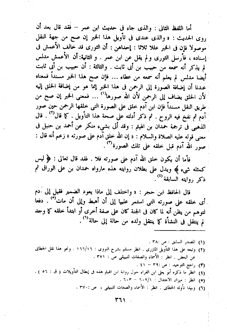 أما اللفظ الثانى: والّذي جاء فى حديث ابن عمر- فقد قال بعد أن روى الحديث: «و الّذي عندى فى تأويل هذا الخبر إن صح من جهة النقل موصولا فإن فى الخبر عللا ثلاثا: إحداهن: أن الثورى قد خالف الأعمش فى إسناده، فأرسل الثورى ولم يقل عن ابن عمر. والثانية: أن الأعمش مدلس لم يذكر أنه سمعه من حبيب بن أبى ثابت. والثالثة: أن حبيب بن أبى ثابت أيضا مدلس لم يعلم أنه سمعه من عطاء ... فإن صح هذا الخبر مسندا فمعناه عندنا أن إضافة الصورة إلى الرحمن فى هذا الخبر إنما هو من إضافة الخلق إليه لأن الخلق يضاف إلى الرحمن لأن اللّه صورها «1» ... فمعنى الخبر إن صح من طريق النقل مسندا فإن ابن آدم خلق على الصورة التى خلقها الرحمن حين صور آدم ثم نفخ فيه الروح. ثم ذكر أدلته على صحة هذا التأويل. كما قال «2». قال الذهبى فى ترجمة حمدان بن الهيثم: وقد أتى بشيء منكر عن أحمد بن حنبل فى معنى قوله عليه الصلاة والسلام: «إن اللّه خلق آدم على صورته» زعم أنه قال: