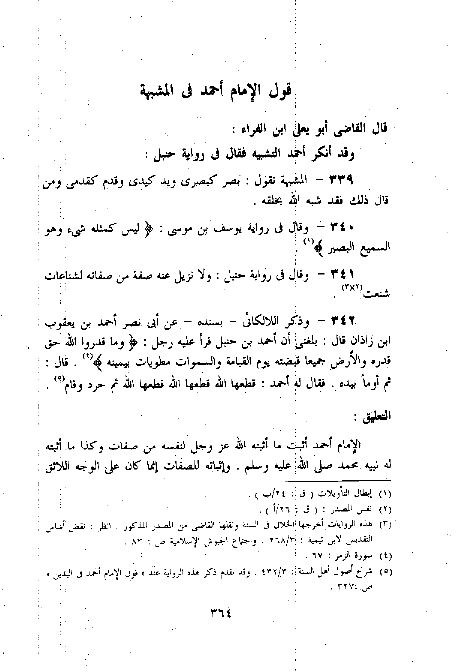 (3) هذه الروايات أخرجها الخلال فى السنة ونقلها القاضى من المصدر المذكور. انظر: نقض أساس التقديس لابن تيمية: 3/ 268. واجتماع الجيوش الإسلامية ص: 83.