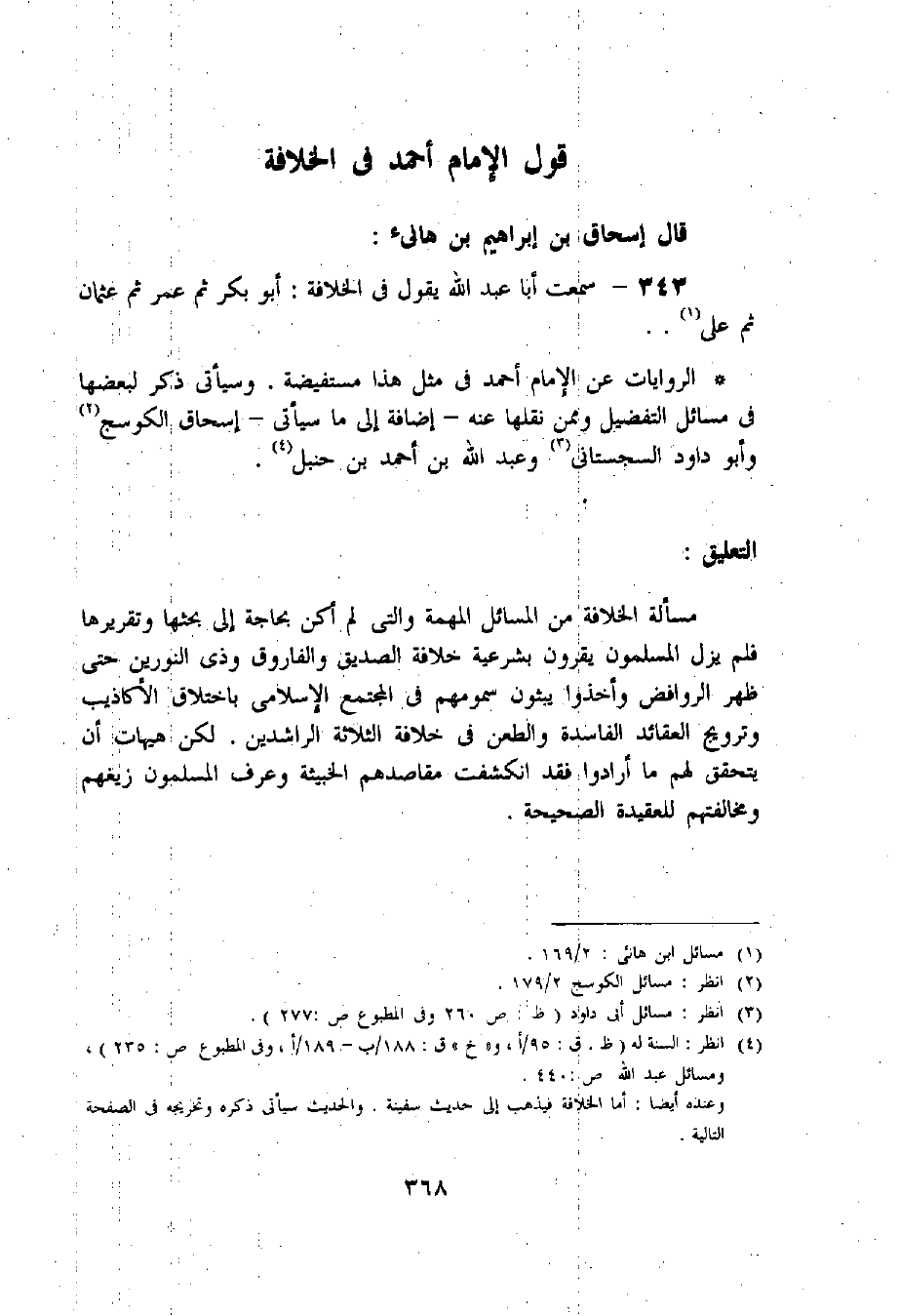 343 - سمعت أبا عبد اللّه يقول فى الخلافة: أبو بكر ثم عمر ثم عثمان ثم على «1» ..