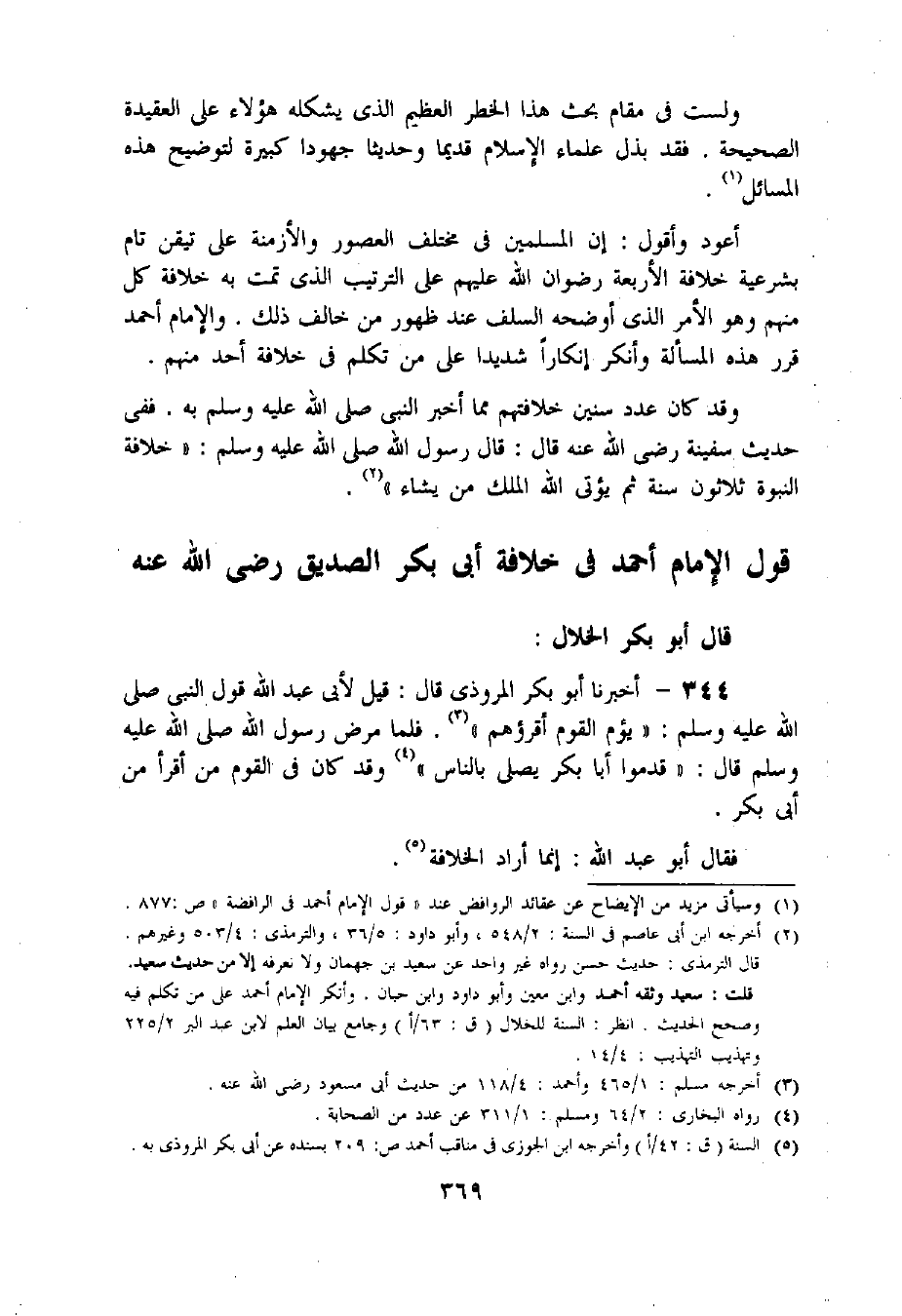 أعود وأقول: إن المسلمين فى مختلف العصور والأزمنة على تيقن تام بشرعية خلافة الأربعة رضوان اللّه عليهم على الترتيب الّذي تمت به خلافة كل منهم وهو الأمر الّذي أوضحه السلف عند ظهور من خالف ذلك. والإمام أحمد قرر هذه المسألة وأنكر إنكارا شديدا على من تكلم فى خلافة أحد منهم.