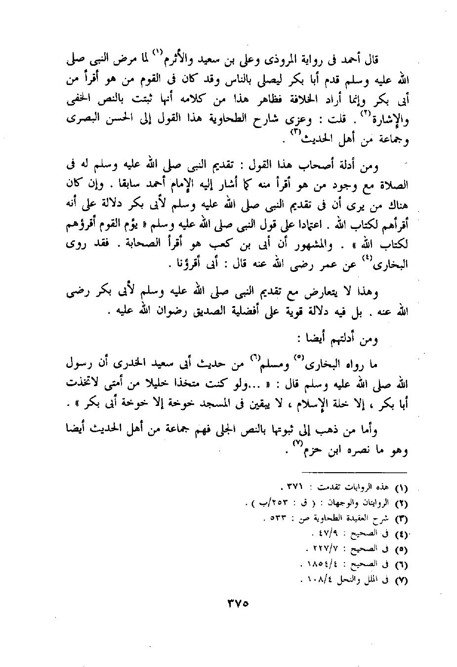 قال أحمد فى رواية المروزي وعلى بن سعيد والأثرم «1» لما مرض النبي صلى اللّه عليه وسلم قدم أبا بكر ليصلى بالناس وقد كان فى القوم من هو أقرأ من أبى بكر وإنما أراد الخلافة فظاهر هذا من كلامه أنها ثبتت بالنص الخفى والإشارة «2». قلت: وعزى شارح الطحاوية هذا القول إلى الحسن البصرى وجماعة من أهل الحديث «3».