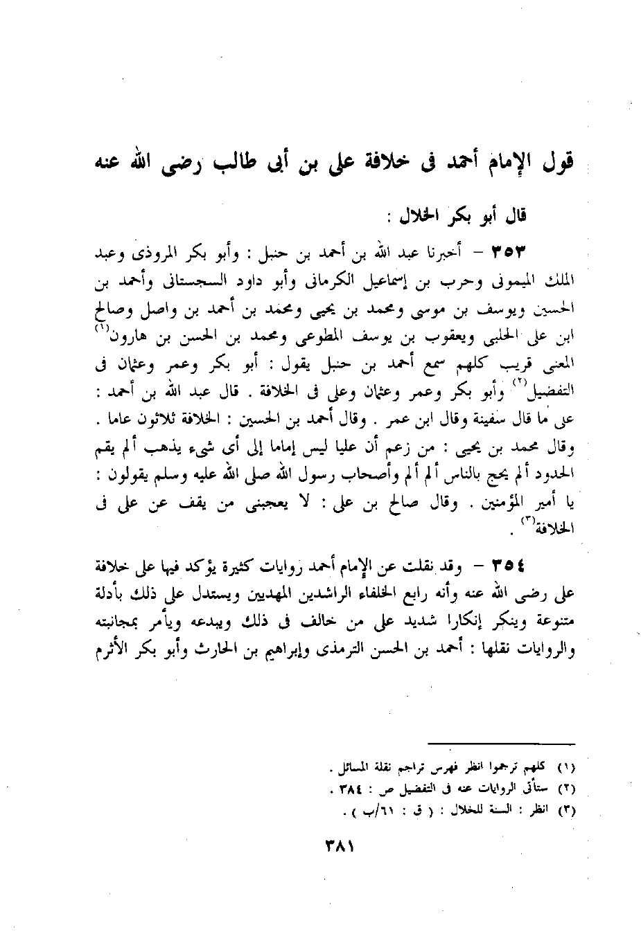 354 - وقد نقلت عن الإمام أحمد روايات كثيرة يؤكد فيها على خلافة على رضى اللّه عنه وأنه رابع الخلفاء الراشدين المهديين ويستدل على ذلك بأدلة متنوعة وينكر إنكارا شديد على من خالف فى ذلك ويبدعه ويأمر بمجانبته والروايات نقلها: أحمد بن الحسن الترمذي وإبراهيم بن الحارث وأبو بكر الأثرم