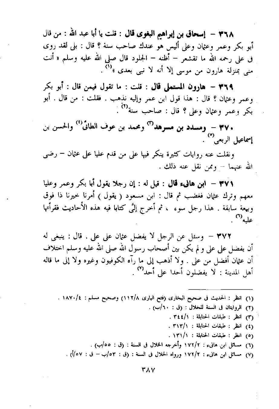 369 - هارون المستملى قال: قلت: ما تقول فيمن قال: أبو بكر وعمر وعثمان؟ قال: هذا قول ابن عمر وإليه نذهب. فقلت: من قال. أبو بكر وعمر وعثمان وعلى؟ قال: صاحب سنة «2».