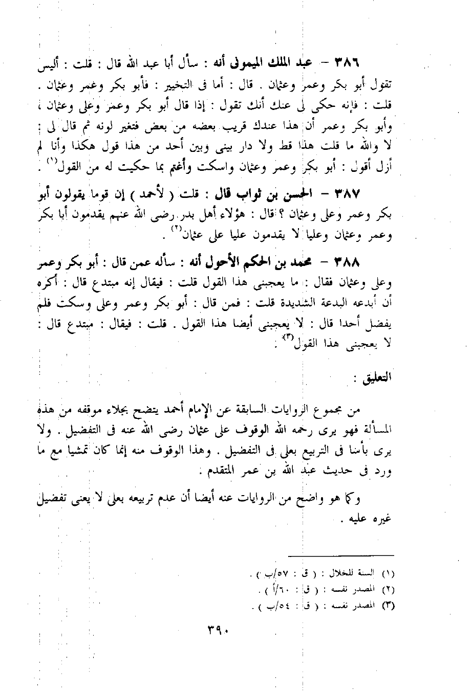 386 - عبد الملك الميمونى أنه: سأل أبا عبد اللّه قال: قلت: أ ليس تقول أبو بكر وعمر وعثمان. قال: أما فى التخيير: فأبو بكر وعمر وعثمان.