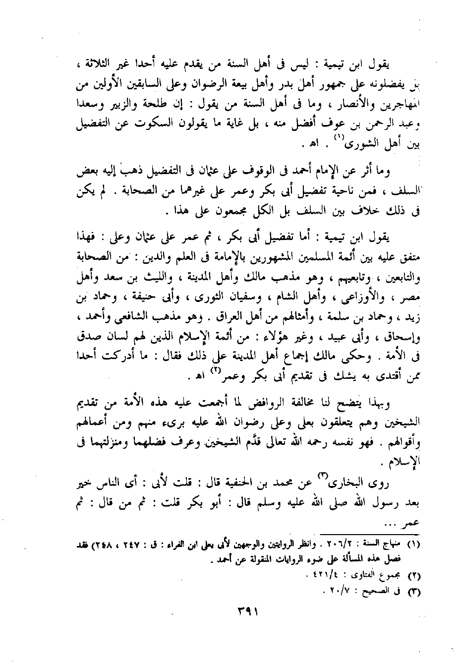 وما أثر عن الإمام أحمد فى الوقوف على عثمان فى التفضيل ذهب إليه بعض السلف، فمن ناحية تفضيل أبى بكر وعمر على غيرهما من الصحابة. لم يكن فى ذلك خلاف بين السلف بل الكل مجمعون على هذا.