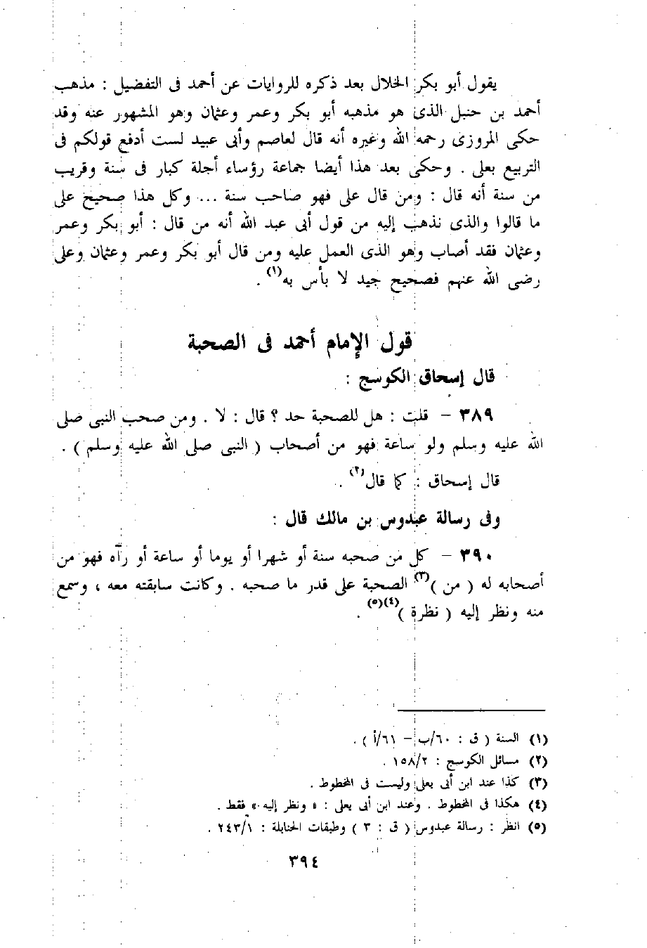 389 - قلت: هل للصحبة حد؟ قال: لا. ومن صحب النبي صلى اللّه عليه وسلم ولو ساعة فهو من أصحاب (النبي صلى اللّه عليه وسلم).