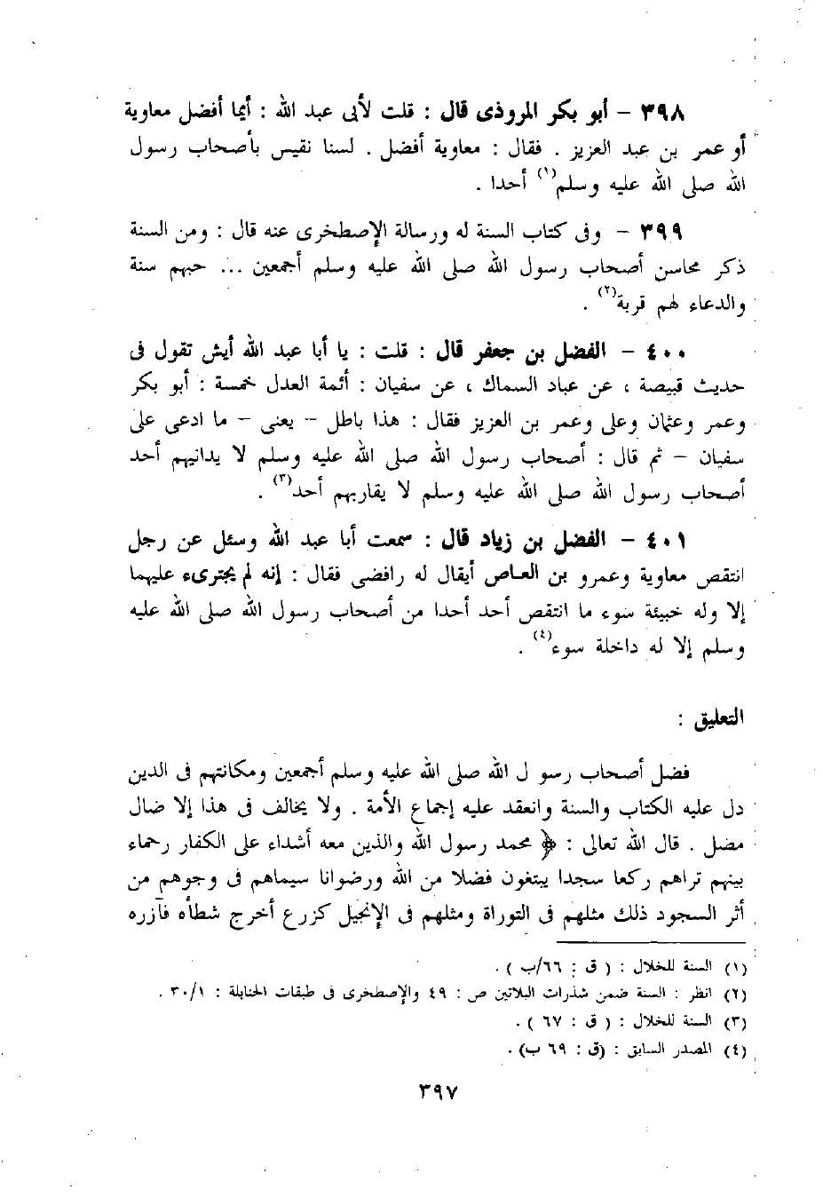 399 - وفى كتاب السنة له ورسالة الإصطخرى عنه قال: ومن السنة ذكر محاسن أصحاب رسول اللّه صلى اللّه عليه وسلم أجمعين ... حبهم سنة والدعاء لهم قربة «2».