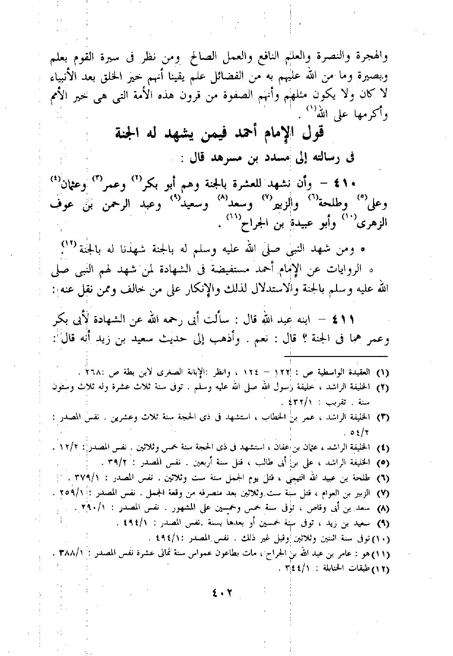 410 - وأن نشهد للعشرة بالجنة وهم أبو بكر «2» وعمر «3» وعثمان «4» وعلى «5» وطلحة «6» والزبير «7» وسعد «8» وسعيد «9» وعبد الرحمن بن عوف الزهرى «10» وأبو عبيدة بن الجراح «11».