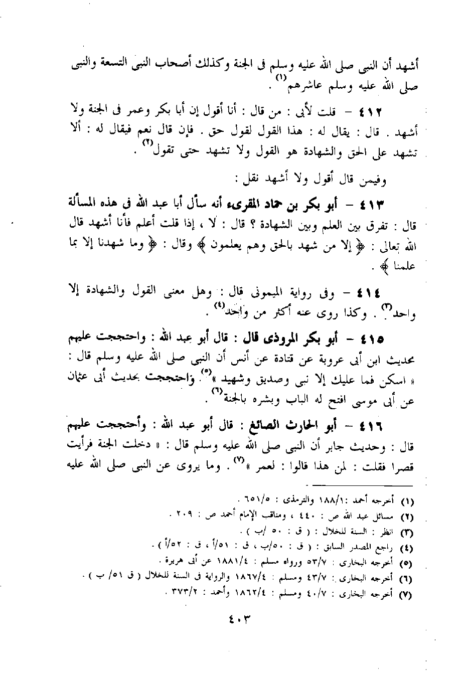 412 - قلت لأبى: من قال: أنا أقول إن أبا بكر وعمر فى الجنة ولا أشهد. قال: يقال له: هذا القول لقول حق. فإن قال نعم فيقال له: ألا تشهد على الحق والشهادة هو القول ولا تشهد حتى تقول «2».