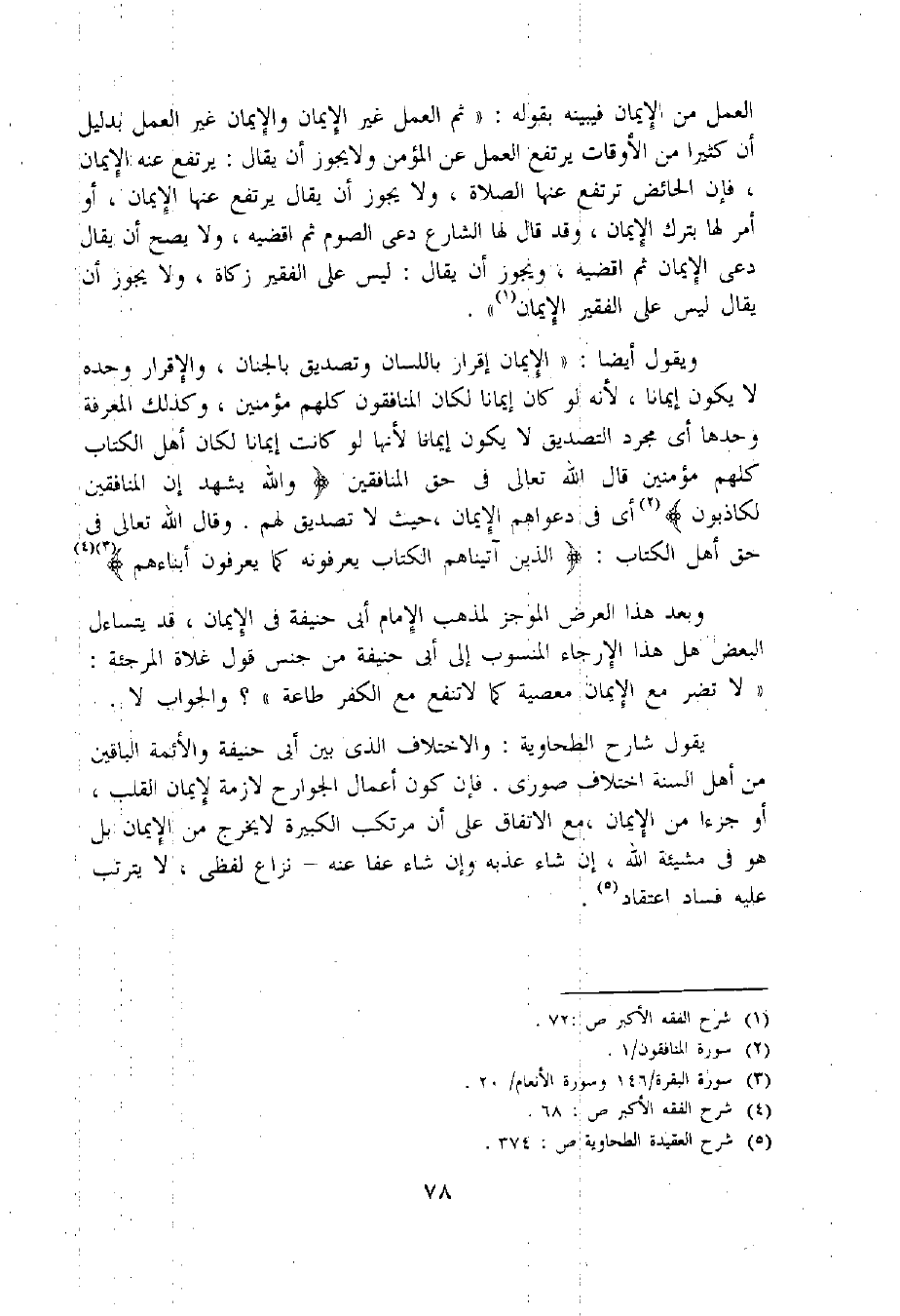 ويقول أيضا: «الإيمان إقرار باللسان وتصديق بالجنان، والإقرار وحده لا يكون إيمانا، لأنه لو كان إيمانا لكان المنافقون كلهم مؤمنين، وكذلك المعرفة وحدها أى مجرد التصديق لا يكون إيمانا لأنها لو كانت إيمانا لكان أهل الكتاب كلهم مؤمنين قال اللّه تعالى فى حق المنافقين واللَّهُ يَشْهَدُ إِنَّ الْمُنافِقِينَ لَكاذِبُونَ «2» أى فى دعواهم الإيمان، حيث لا تصديق لهم. وقال اللّه تعالى فى حق أهل الكتاب: الَّذِينَ آتَيْناهُمُ الْكِتابَ يَعْرِفُونَهُ كَما يَعْرِفُونَ أَبْناءَهُمْ «3» «4» وبعد هذا العرض الموجز لمذهب الإمام أبى حنيفة فى الإيمان، قد يتساءل البعض هل هذا الإرجاء المنسوب إلى أبى حنيفة من جنس قول غلاة المرجئة: