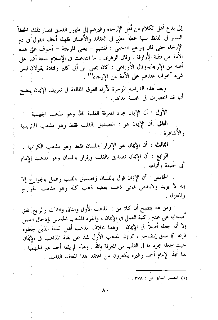ومن هنا يتضح أن كلا من: المذهب الأول والثانى والثالث والرابع اتفق أصحابه على عدم ركنية العمل فى الإيمان، وانفرد المذهب الخامس بإدخال العمل إلا أنه جعله أصلا فى الإيمان. وهذا خلاف مذهب أهل السنة الذين جعلوه فرعا كما سبق إيضاحه، ثم إن المذهب الأول شذ عن بقية المذاهب فى الإيمان حيث جعله مجرد ما فى القلب من المعرفة باللّه. وهذا لم يقله أحد غير الجهمية.