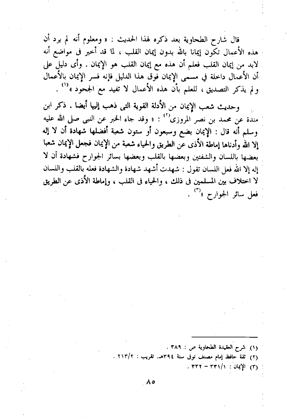 وحديث شعب الإيمان من الأدلة القوية التى ذهب إليها أيضا. ذكر ابن مندة عن محمد بن نصر المروزى «2»: «و قد جاء الخبر عن النبي صلى اللّه عليه وسلم أنه قال: الإيمان بضع وسبعون أو ستون شعبة أفضلها شهادة أن لا إله إلا اللّه وأدناها إماطة الأذى عن الطريق والحياء شعبة من الإيمان فجعل الإيمان شعبا بعضها باللسان والشفتين وبعضها بالقلب وبعضها بسائر الجوارح فشهادة أن لا إله إلا اللّه فعل اللسان تقول: شهدت أشهد شهادة والشهادة فعله بالقلب واللسان لا اختلاف بين المسلمين فى ذلك، والحياء فى القلب، وإماطة الأذى عن الطريق فعل سائر الجوارح» «3».